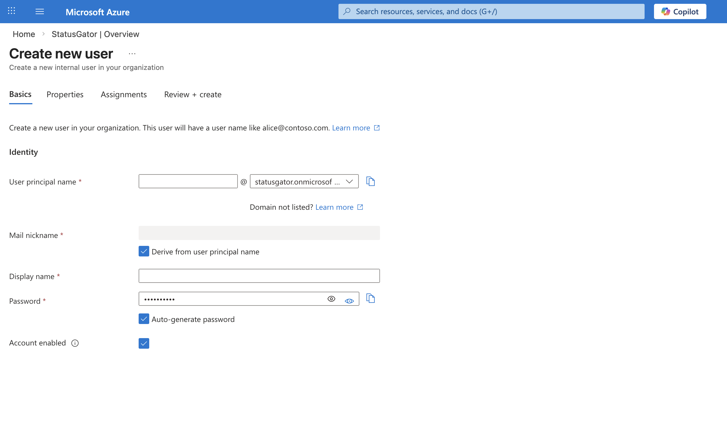 This user will later be assigned a limited read-only role that allows StatusGator to access Azure Resource Health data.