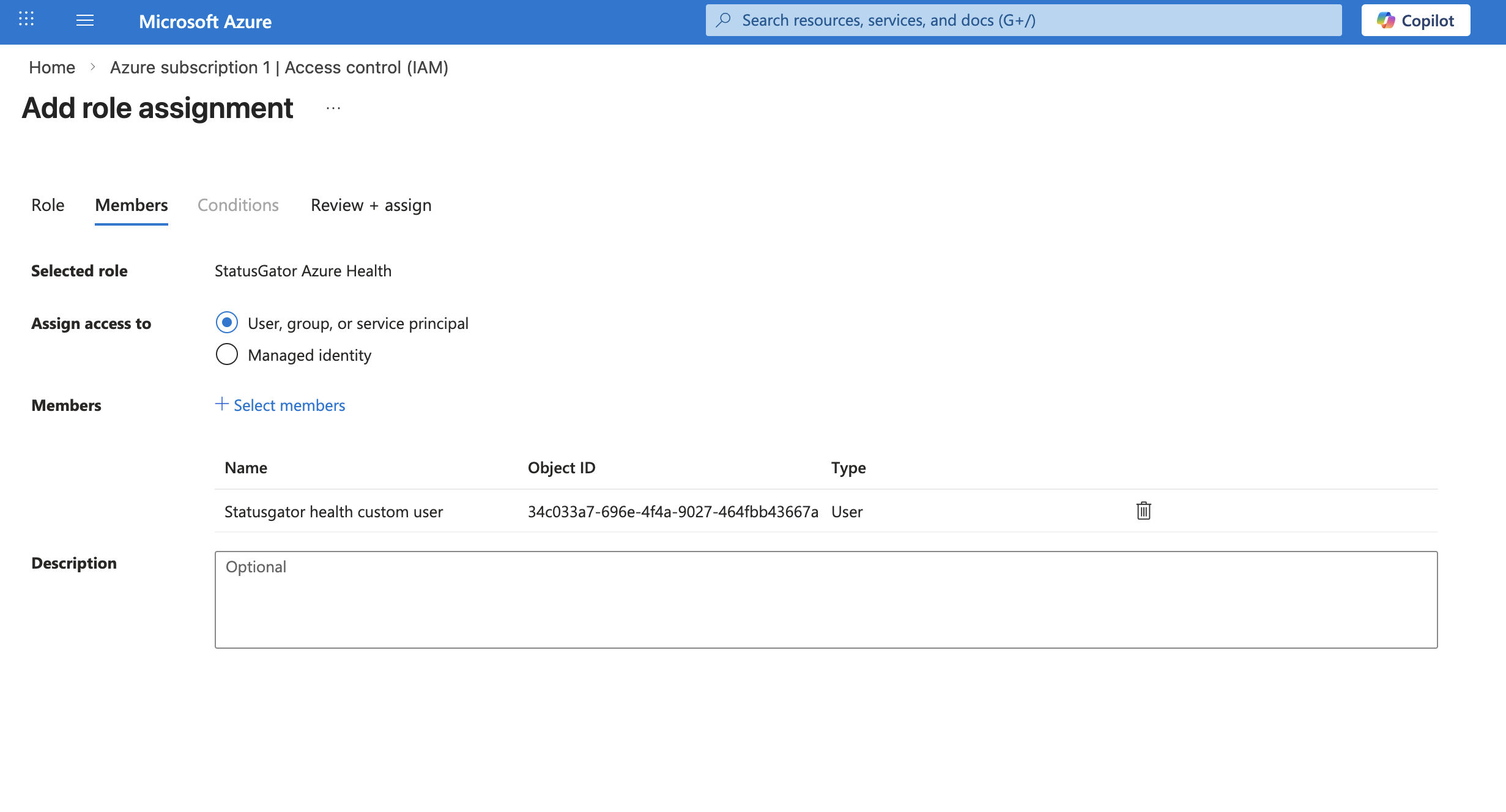 The role will now be assigned to the integration user, allowing StatusGator to read Azure Resource Health data at this management group level.