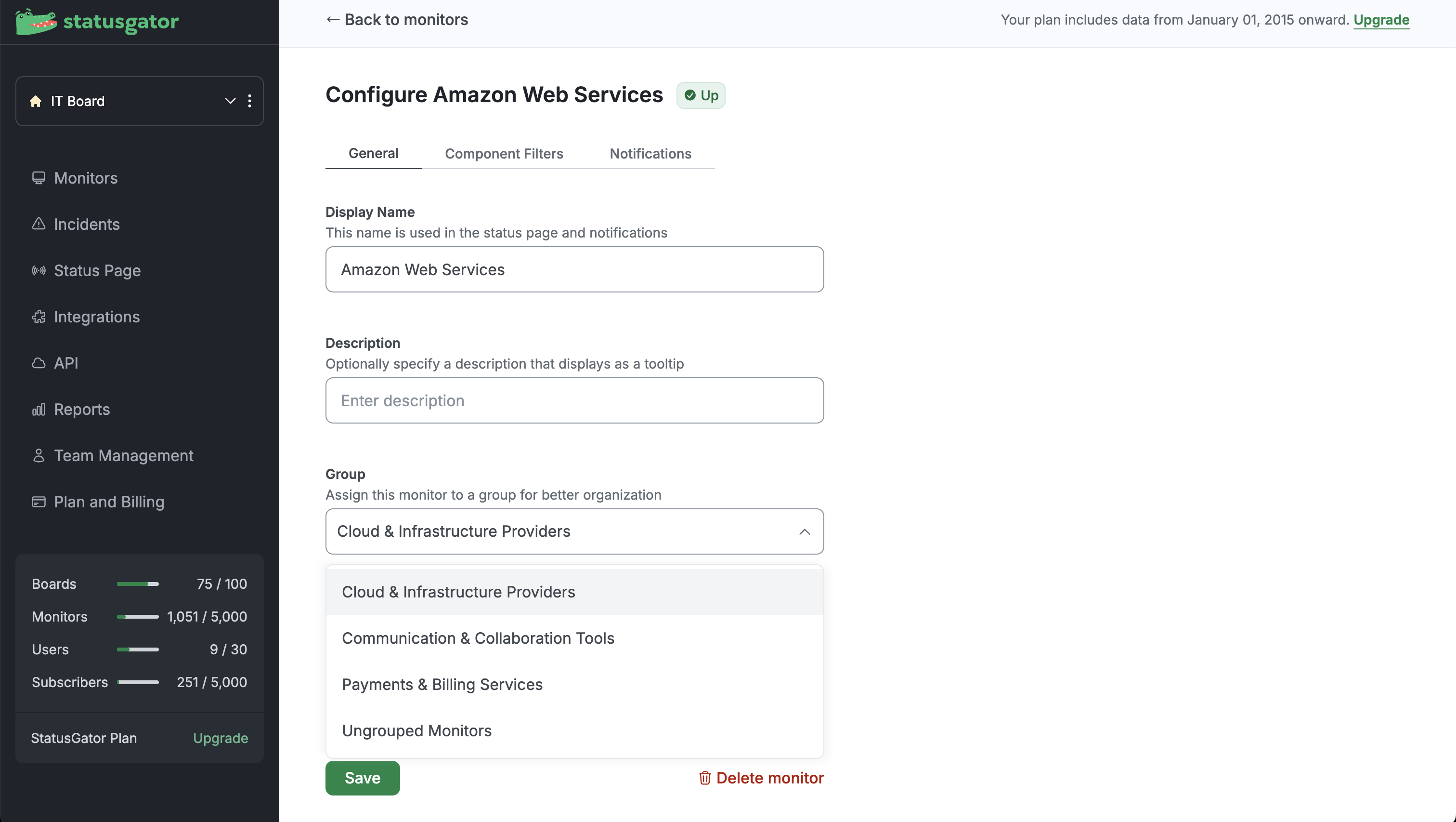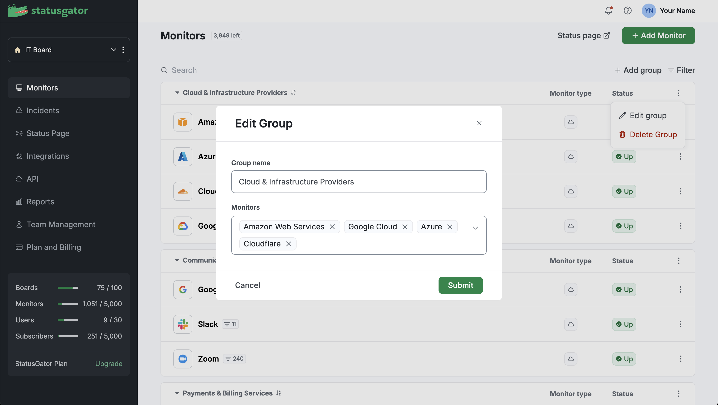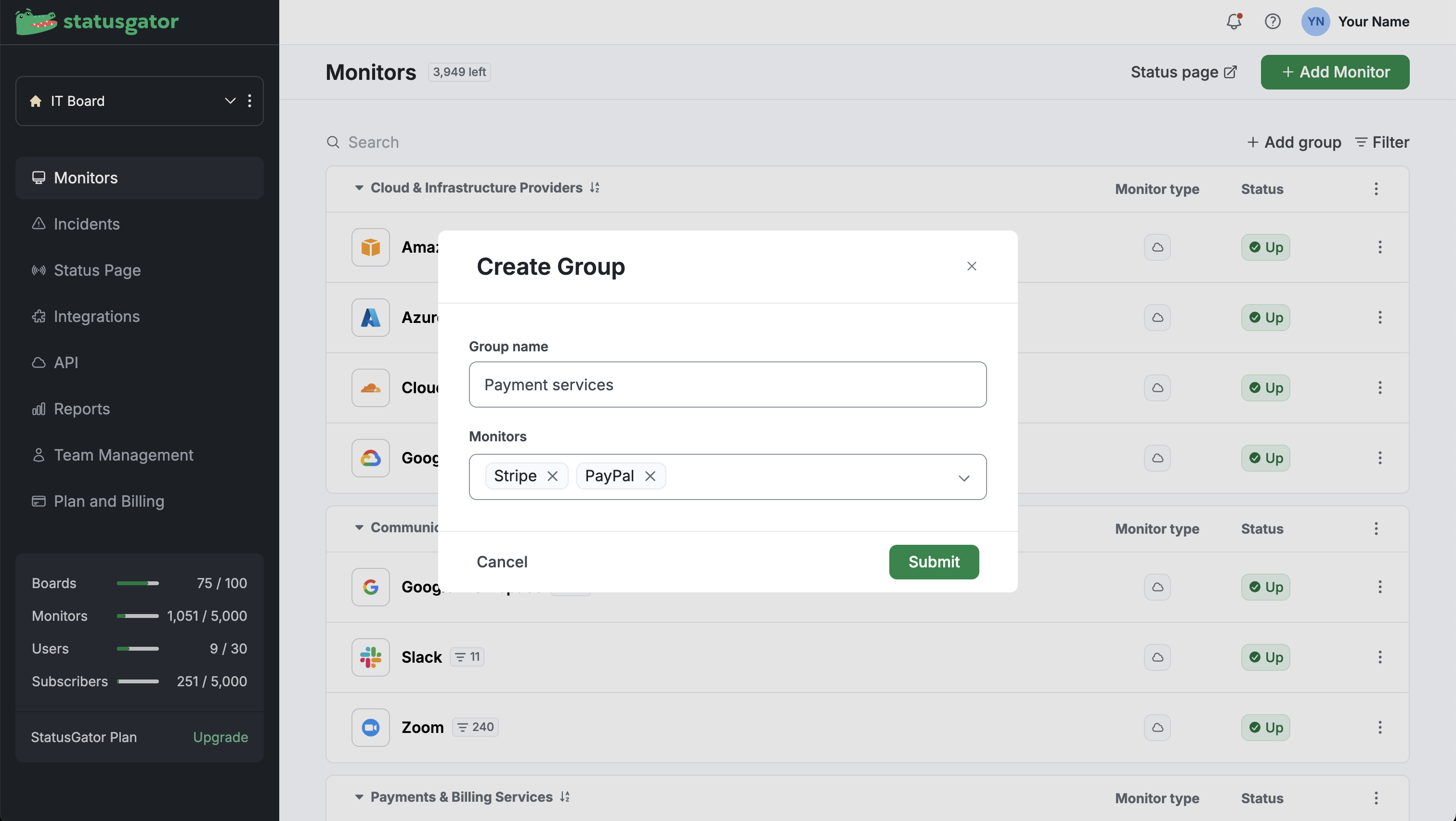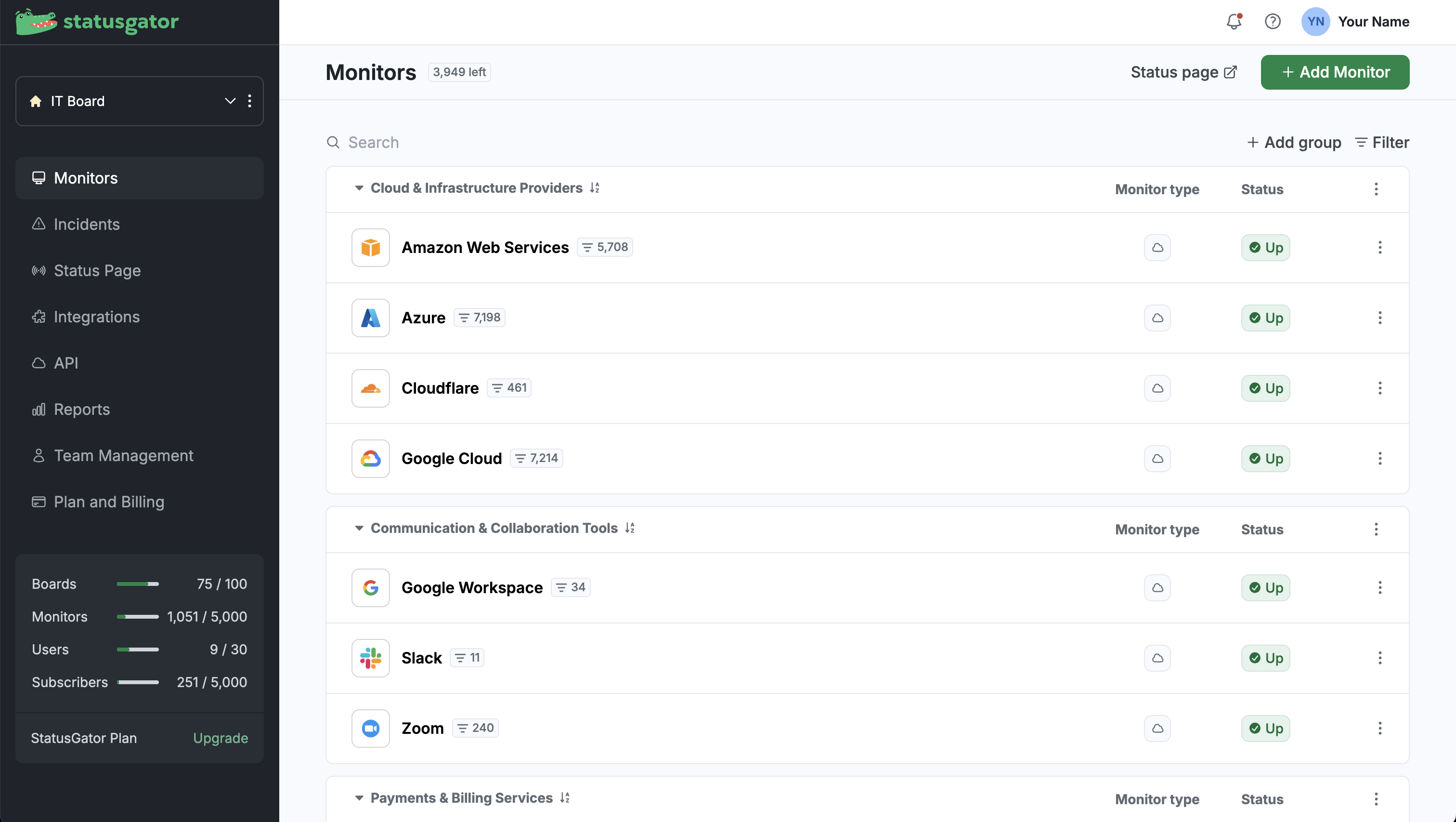 Monitor groups help you organize related monitors, reduce clutter, and present a clearer view of system health across StatusGator.